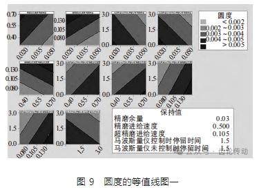 通過對圓度磨削過程的分析,識別出 17 個影響圓度的工藝參數。通過 Plackett-Burman 設計方法,從 18 個工藝參數中識別出 5 個影響顯著的因子。如圖 8 所示,分別是超精磨進給速度、精磨余量、馬波斯量儀未控制時停留時間、精磨進給速度、馬波斯量儀控制時停留時間等 5 個因子。