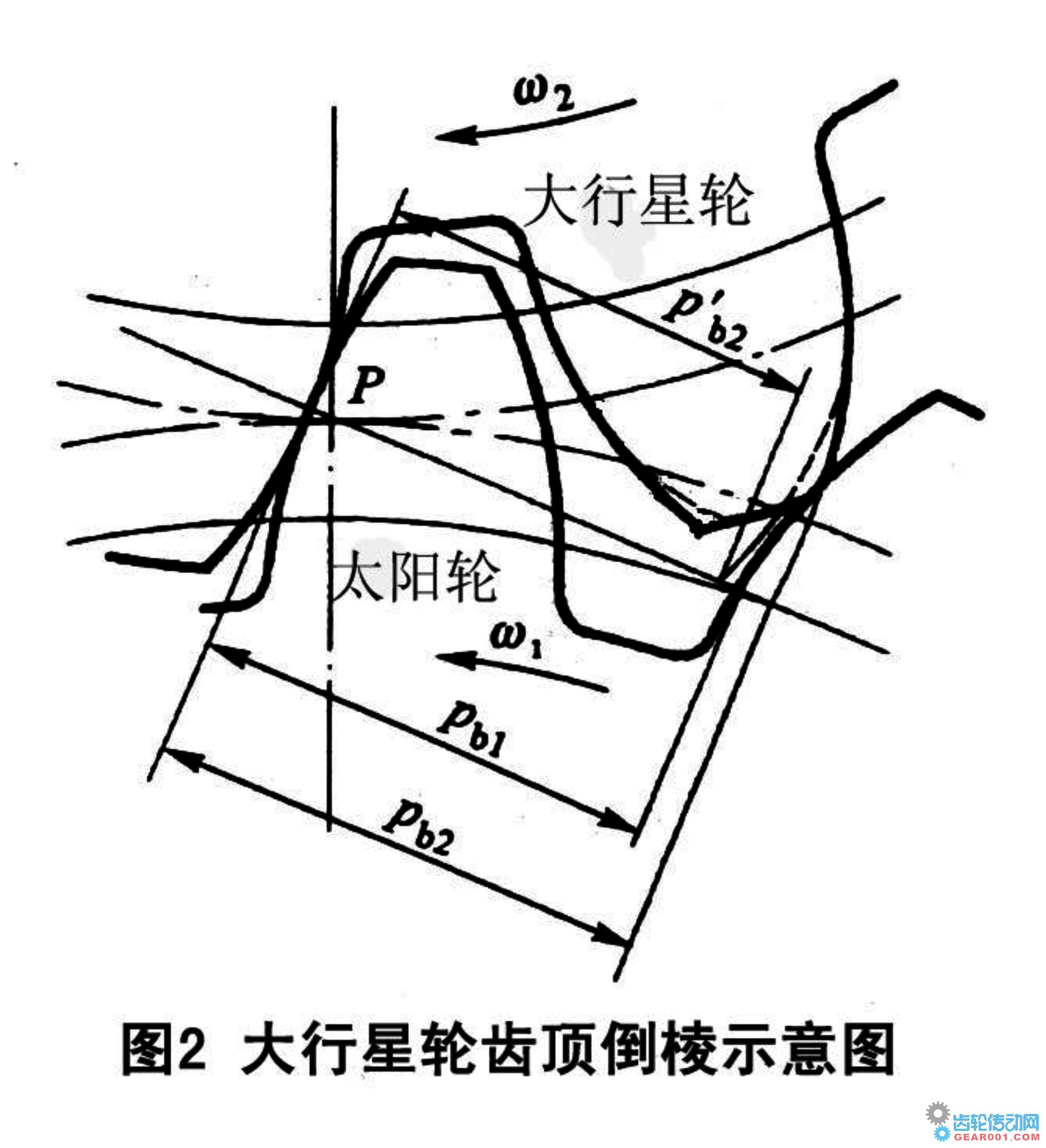 見圖2所示。因Pb2>Pb1,則后一對(duì)輪齒在未進(jìn)入嚙合區(qū)時(shí)就開始接觸,從而產(chǎn)生動(dòng)載荷。為此將大行星輪齒頂?shù)估猓笮行禽喌奶摼€齒廓為齒頂?shù)估夂蟮凝X廓。實(shí)線齒廓為未經(jīng)齒頂?shù)估恺X廓。由圖2可知,齒頂?shù)估夂蟮妮嘄X齒頂處的P′b2Pb1時(shí),對(duì)齒頂?shù)估獾妮嘄X,在開始嚙合階段,相嚙合的輪齒的法節(jié)差就小,嚙合時(shí)產(chǎn)生的動(dòng)載荷也就小,因此齒頂?shù)估夂蟊厝粫?huì)減小齒輪的噪音。對(duì)齒輪齒頂兩側(cè)進(jìn)行齒頂?shù)估猓墙档妄X輪嚙合噪音的有效手段。