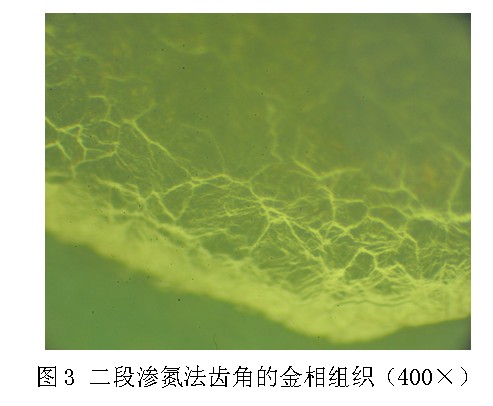 對(duì)產(chǎn)品進(jìn)行理化檢驗(yàn),其表面硬度為1110-1130HV。用制樣機(jī)將錐齒輪的齒角處制成金相試樣,采用4%的硝酸酒精溶液腐蝕,在金相顯微鏡下觀察組織,見圖3。進(jìn)過檢驗(yàn),產(chǎn)品氮化層深為0.37mm,化合物層深0.012mm。
