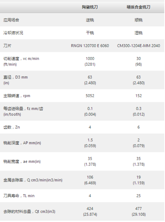 為了在此類應用中獲得成功,需要對切削工藝進行精心規(guī)劃。與采用硬質合金銑刀的常規(guī)方法不同,陶瓷面銑刀的切削速度可達 1000m/min,比硬質合金銑刀的金屬切除率高 5 倍以上。