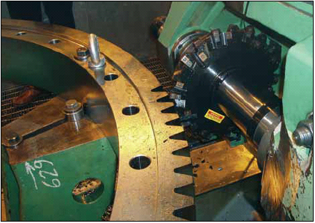 Takoma公司過去一直采用高速鋼滾齒刀切削齒輪齒。在2009年,公司購買了多臺新機床,用于生產船用大型齒輪零件。外徑大約為2米(6.56英尺)的回轉支承軸承由42CrMo4鋼制成,且要求更高的尺寸公差。Takoma公司最初采用專用齒輪銑刀加工回轉支承軸承的齒,但這樣做成本很高且交貨期長達12周。為了尋求更好的解決方案,公司向一家刀具供應商做了詢問,該供應商提供的刀具主要用在零件的其它加工中。