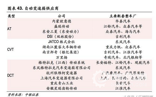 根據(jù)自動變速箱的發(fā)展前景及國內(nèi)企業(yè)的進展情況來看,國產(chǎn)自動變速箱正在崛起,有望帶動產(chǎn)業(yè)鏈零部件企業(yè)在未來 2-3 年高速增長。綜上所述,我們 整理了自動變速箱核心供應(yīng)商信息,可以發(fā)現(xiàn)國內(nèi)供應(yīng)商較少,僅有雙環(huán)傳 動、精鍛科技、圣龍股份、航天動力等。