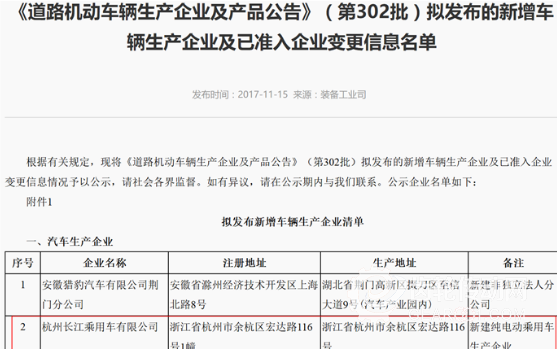 11月15日,工信部對第302批《道路機動車輛生產企業及產品公告》擬發布的新增車輛生產企業及已準入企業變更信息名單進行了公示,其中杭州長江乘用車有限公司(簡稱“長江汽車”)也赫然在列,這也將是繼蘭州知豆之后,第五家獲得工信部準入的車企。