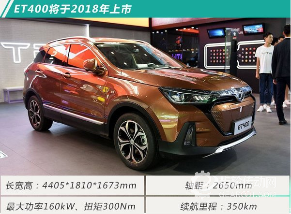 北京新能源汽車營銷有限公司副總經理陸皓表示:2018年是北汽新能源產品大年,至少會有3款純電動新車型上市,包括全新緊湊型SUV、全新緊湊型轎車以及全新小型轎車。其中ET400已經在廣州車展上正式發布,預計將率先投放市場。新車搭載最大功率160kW、最大扭矩300Nm的永磁同步電機,最高車速可達160km/h,續航里程350km。