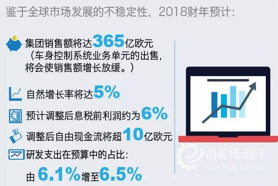 全球市場風云變幻。考慮到這些市場因素,采埃孚首席執行官施艾德預期,2018財年的自然增長率將為5%左右。采埃孚向香港立訊有限公司(Luxshare Limited)出售全球車身控制系統業務的交易預計會很快完成,這將會使銷售額的增長放緩。因此,在本財政年度,采埃孚預計集團銷售約為365億歐元。如之前幾年一樣,采埃孚預計調整后的息稅前利潤率約為6%,調整的自由現金流量將超過10億歐元。