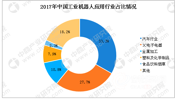 近年來,隨著工業機器人的快速發展,工業機器人應用行業不斷拓展,數據顯示,2017年中國工業機器人應用行業占比情況中,汽車行業仍是工業機器人最主要的應用領域,其次為3C電子電氣行業,占比為27.65%;其后分別為金屬加工、塑料及化學制品、食品飲料煙,占比分別為10.76%、7.85%、2.27%。