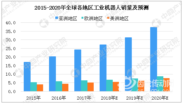 在全球各地區工業機器人銷量情況中,2017年亞洲工業機器人總銷量達到24.2萬臺,工業機器人銷量實現爆發式增長,預計2020年銷量將有望突破35萬臺;2017年歐洲工業機器人銷量為6.4萬臺,與2016年的5.9萬臺增長8.9%;美洲地區工業機器人銷量為5.0萬臺,同比增長17.1%。