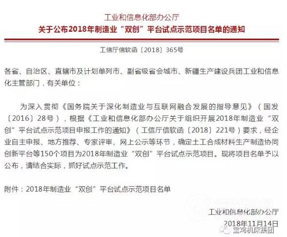 在工信部11月14日發布的《2018年制造業“雙創”平臺試點示范項目名單》中,確定了寶雞機床集團中高檔數控機床研發生產“雙創”資源匯聚平臺建設項目等150個項目為2018年制造業“雙創”平臺試點示范項目。此次入選,是對公司信息化建設成果的肯定,為機床制造業企業“兩化”深度融合起到積極的示范作用。