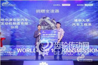 加特可(廣州)自動(dòng)變速箱有限公司開發(fā)部長洪震(左一)向清華大學(xué)汽車工程系捐贈(zèng)獲獎(jiǎng)變速器