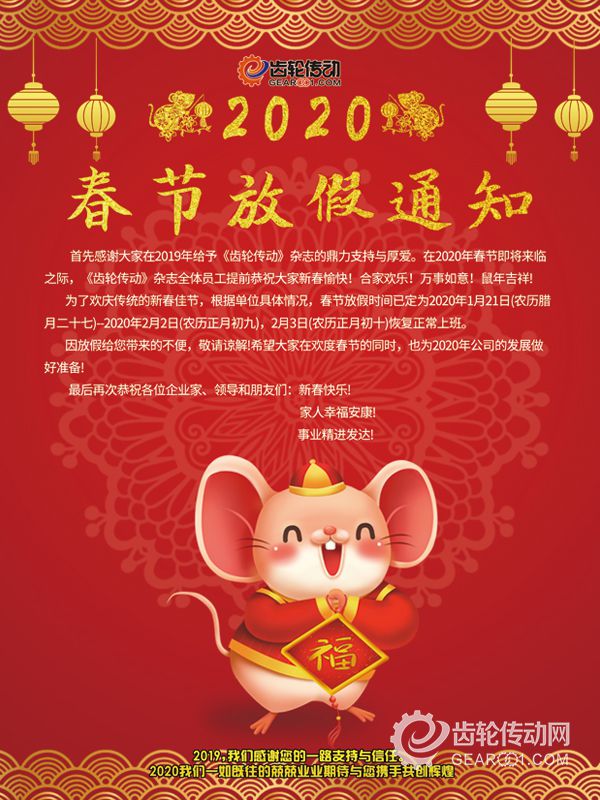 首先感謝大家在2019年給予《齒輪傳動》雜志的鼎力支持與厚愛。在2020年春節即將來臨之際,《齒輪傳動》雜志全體員工提前恭祝大家新春愉快!合家歡樂!萬事如意!鼠年吉祥!