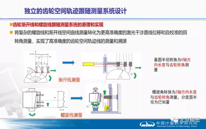 跟隨系統按照項目研發的齒輪螺旋線漸開線空間展成模型設計路徑規劃,合理設置X/Z向直線位移與回轉角的不同步距,使得激光干涉直線位移光路能同步跟隨上按照齒輪空間軌跡線運行的小反射鏡,并通過回轉臺的測量同步觸發,實時同步采集激光干涉位移、回轉角位移和3D探測系統的微位移信號,得到齒面軌跡實際測量信息,最后通過項目研發的齒輪螺旋線漸開線修正模型運算得到齒輪空間軌跡實際擬合線及齒輪參量誤差。項目將復雜的螺旋線和漸開線空間曲線測量轉化為更高準確度的激光干涉直線位移和自校準的回轉角測量,實現了高準確度的齒輪空間軌跡線的測量及齒輪參量的直接溯源。不采用控制生成系統中的多軸光柵尺的信號做測量,也就最大程度避免生成系統的多軸結構幾何誤差對測量的影響。