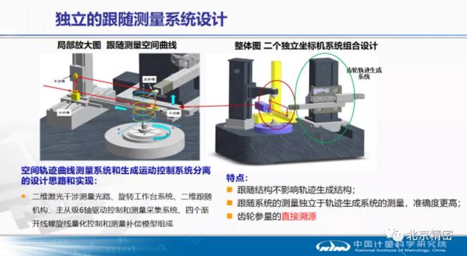 為了達到基準高精度測量和直接溯源的目標,又為了規避商品類儀器修正模型不向國內開放的限制,項目提出了空間軌跡曲線測量系統和生成運動控制系統分離的設計方案,整套裝置結構在國內加工和調試,其中空間軌跡生成運動控制系統采用了商用的坐標機多軸聯動控制方案和技術,只用來做齒輪螺旋線和漸開線軌跡的生成,而齒輪測量和溯源的部分則由空間軌跡跟隨測量系統實現,整個跟隨測量系統由項目獨立設計的二維激光干涉測量光路、自校準回轉工作臺系統、二維跟隨機構、主從級6軸驅動控制和測量采集系統以及四個漸開線螺旋線量化控制和測量補償模型組成。從外觀結構看,整套裝置變成了一個6軸坐標系統,空間軌跡跟隨測量系統被嵌套于齒輪空間軌跡生成系統(齒輪測量中心)內,但又相互分離。跟隨測量系統具備如下三個特點: