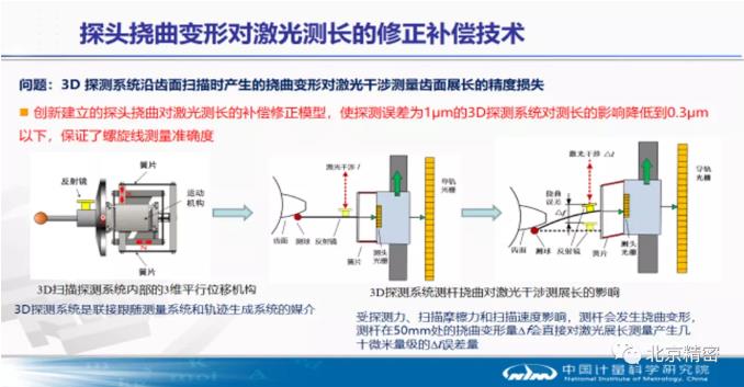 針對3D 探測系統沿齒面掃描時產生的撓曲變形對激光干涉測量齒面展長的精度損失問題,建立了激光測長補償技術,使探測誤差為1μm的3D探測系統對測長的影響降低到0.3μm以下,保證了漸開線和螺旋線測量準確度。