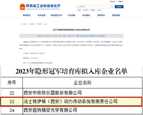 日前,陜西省工業(yè)和信息化廳公布了2023年隱形冠軍培育庫擬入庫企業(yè)名單,法士特伊頓(西安)動力傳動系統(tǒng)有限責任公司成功入選。