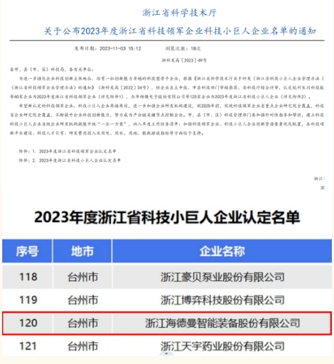 近日,浙江省科學技術廳發布了《關于公布2023年度浙江省科技領軍企業、科技小巨人企業名單的通知》,浙江海德曼智能裝備股份有限公司榮列其中,順利獲評“浙江省科技小巨人企業”稱號。