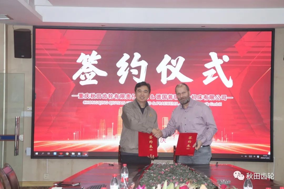 11月22日,重慶秋田齒輪有限責(zé)任公司與德國普瑞威馬機床有限公司珩齒機設(shè)備采購合作協(xié)議簽約儀式成功舉行。秋田公司副董事長劉一、技術(shù)副總鄭直,德國PRAEWEMA 亞洲區(qū)銷售總監(jiān)Mr Schmiedel、德福埃斯精密機械公司副總經(jīng)理高義軍出席簽約儀式。