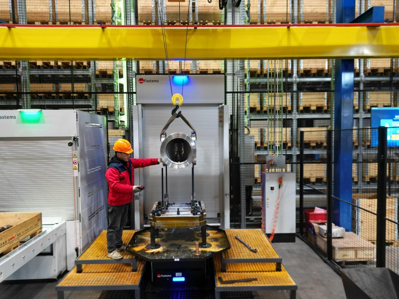 當走進車間,這條柔性線真實矗立在眼前時,其所帶來的震撼無以名狀。只見,長度近百米、高度近八米的五層立體庫整齊排列,庫內集成有一臺垛機,以每分鐘210米的超快速度,高效且有序地將各類托盤以及托盤上的毛坯、在制品等搬運至產線內的6臺機床和3個裝載站內。所有工序僅依靠兩位技術人員,通過操作控制面板與裝夾零件來完成。