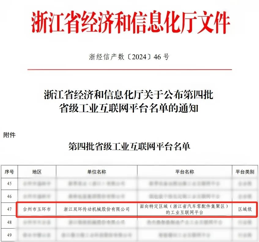 近日,浙江省經濟和信息化廳發布《關于公布第四批省級工業互聯網平臺名單的通知》,雙環傳動《面向特定區域(浙江省汽車零配件集聚區)的工業互聯網平臺》項目成功入選。這是對雙環數字化建設工作的充分肯定,將進一步推動公司實現數字化轉型發展。