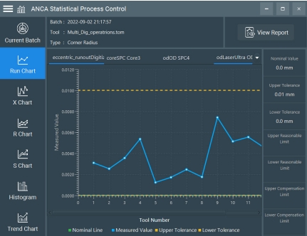 SPC(統計過程控制):ANCA 經過改進的 SPC 軟件使用戶能夠在大批量生產過程中對生產流程進行全面控制。主要功能包括: