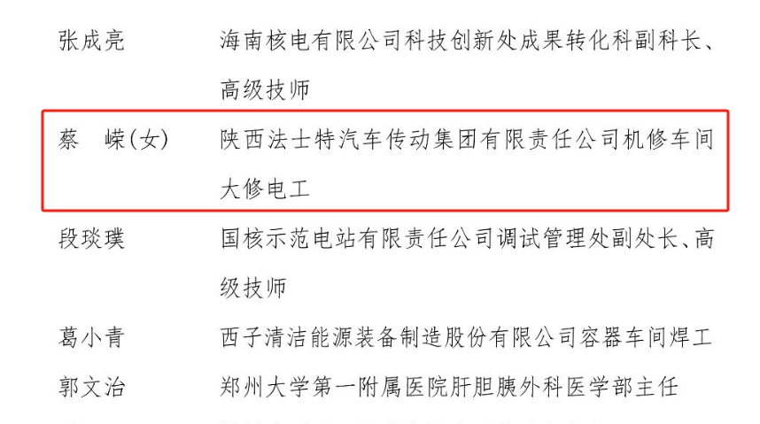 6月11日,全國(guó)總工會(huì)對(duì)大國(guó)工匠人才培育工程2024年擬入選培育對(duì)象進(jìn)行公示,其中,陜西法士特汽車(chē)傳動(dòng)集團(tuán)有限責(zé)任公司機(jī)修車(chē)間大修電工蔡嶸上榜!