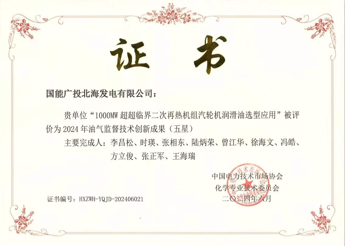 “1000MW超超臨界二次再熱機組汽輪機潤滑油選型應(yīng)用” 榮獲 “2024年油氣監(jiān)督技術(shù)創(chuàng)新成果”