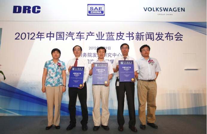 原國務(wù)院發(fā)展研究中心副主任魯志強(qiáng),中國汽車工程學(xué)會副秘書長張進(jìn)華,國務(wù)院發(fā)展研究中心產(chǎn)業(yè)經(jīng)濟(jì)研究部部長馮飛,中國汽車工程學(xué)會副秘書長兼汽車產(chǎn)業(yè)研究院執(zhí)行院長張寧,國務(wù)院發(fā)展研究中心產(chǎn)業(yè)經(jīng)濟(jì)研究部副部長石耀東,大眾汽車集團(tuán)(中國)執(zhí)行副總裁張綏新等三方領(lǐng)導(dǎo)共同出席并見證了2012年中國汽車產(chǎn)業(yè)藍(lán)皮書的問世。