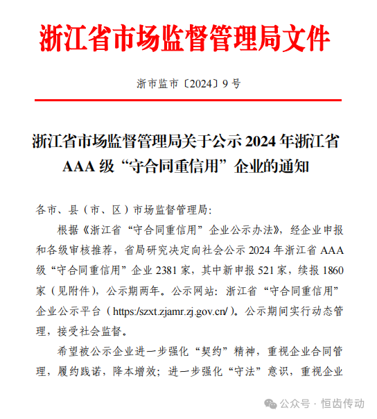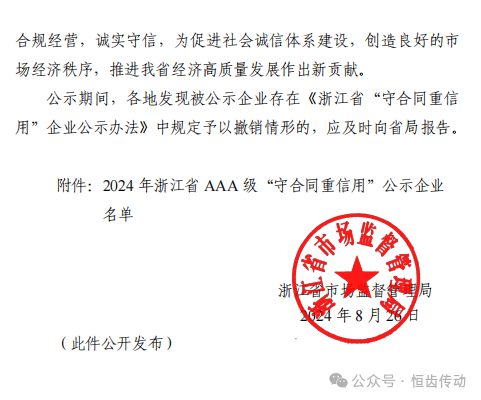 此次再度榮獲浙江省 AAA 級(jí)“守合同重信用”稱號(hào),是對(duì)恒齒傳動(dòng)多年來(lái)努力的最好回報(bào)。這一榮譽(yù)的背后,是恒齒傳動(dòng)全體員工的辛勤付出和無(wú)私奉獻(xiàn)。恒齒傳動(dòng)將繼續(xù)秉承“守合同、重信用”的理念,帶動(dòng)更多的企業(yè)加入到“守合同重信用”的行列中來(lái),共同營(yíng)造良好的市場(chǎng)環(huán)境。