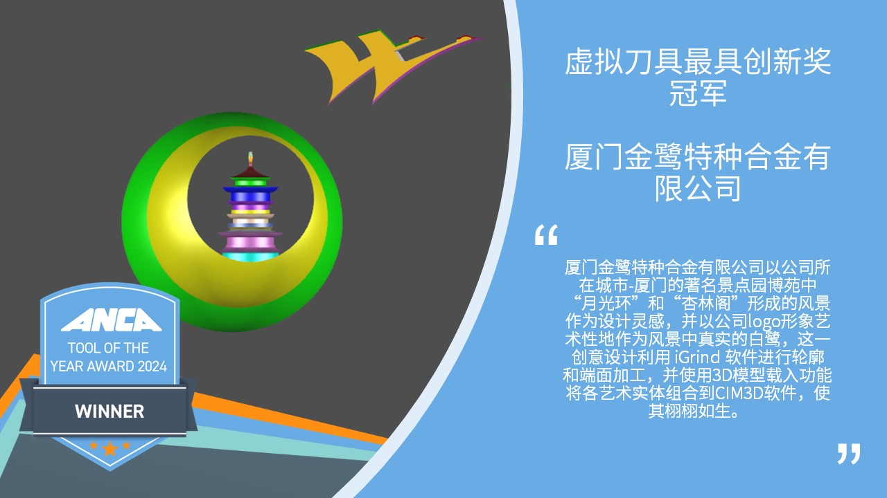 來自中國廈門金鷺特種合金有限公司研發工程師陳劍明對獲得最具創新獎表示感謝,他說:“這個獎項是對我們團隊創新能力的充分肯定。我們的設計靈感來自廈門園博苑的‘月光環’和‘杏林閣’,象征著自然與人文的和諧。設計中的白鷺被我們的公司標志所取代,既是對我們品牌的致敬,也是刀具創新的一大飛躍。”