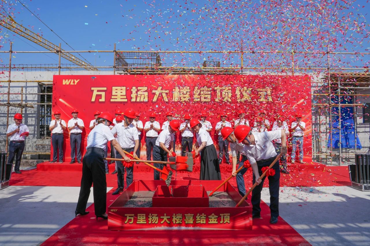 上午10點18分,伴隨著禮炮齊鳴,儀式迎來最激動人心的一刻,集團董事長黃河清、集團總裁吳月華、股份總裁顧勇亭、集團副總裁黃仁興、集團副總裁吳妙貞、股份董事胡春榮,共同為萬里揚大樓結頂完成最后一鍬混凝土的澆筑,至此結頂儀式圓滿禮成。