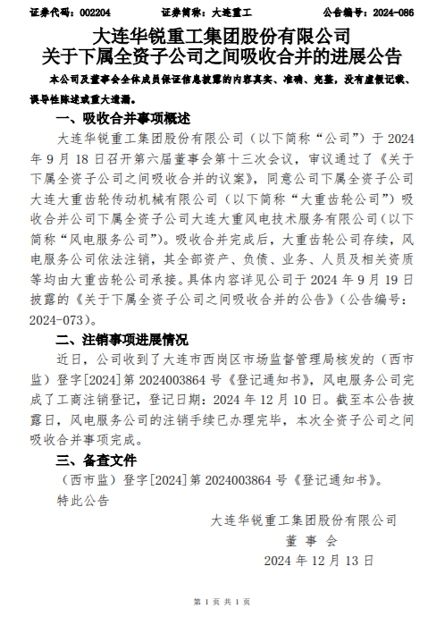 12月13日,大連華銳重工集團股份有限公司(以下簡稱“大連重工”)發布《關于下屬全資子公司之間吸收合并的進展公告》。