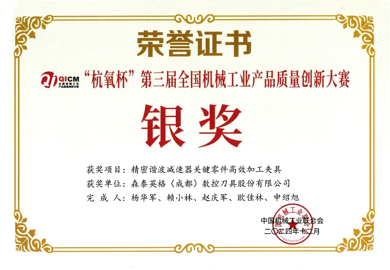 12月11日,第三屆全國(guó)機(jī)械工業(yè)產(chǎn)品質(zhì)量創(chuàng)新大賽頒獎(jiǎng)活動(dòng)在杭州舉行。森泰英格(成都)數(shù)控刀具股份有限公司“精密諧波減速器關(guān)鍵零件高效加工夾具” 在眾多參賽項(xiàng)目中脫穎而出,獲得大賽銀獎(jiǎng),也是繼2023年榮獲第二屆全國(guó)機(jī)械工業(yè)產(chǎn)品質(zhì)量創(chuàng)新大賽銀獎(jiǎng)后再次獲此殊榮。