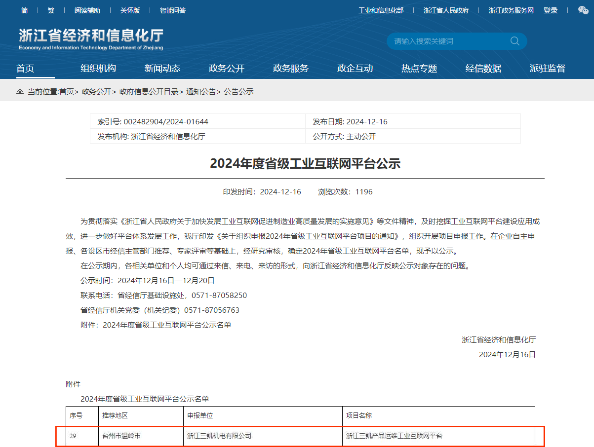 近日,浙江省經濟和信息化廳公示2024年度省級工業互聯網平臺名單,“浙江三凱產品運維互聯網平臺”項目成功入選!