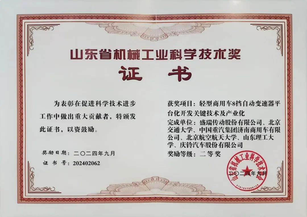 12月21日,山東省機械工業協會在濟南頒發2024年度山東省機械工業科學技術獎,盛瑞“輕型商用車8擋自動變速器平臺化開發關鍵技術及產業化”榮獲山東省機械工業科學技術獎二等獎。