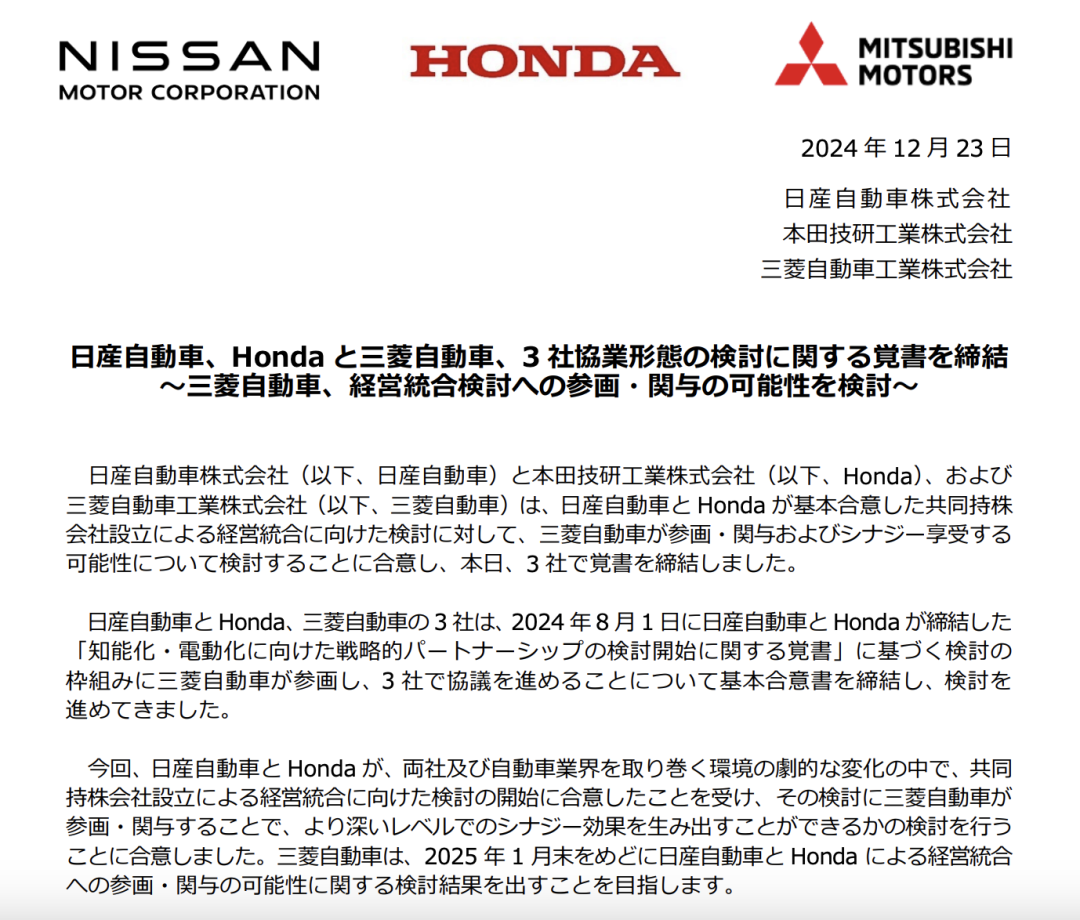 據(jù)了解,本田汽車和日產汽車計劃共同出資成立控股公司,雙方均作為該控股公司子公司的方式進行合并,合并后可實現(xiàn)整體年銷售額超30萬億日元、年營業(yè)利潤超3萬億日元的目標。文件顯示,控股公司董事會超半數(shù)成員將由本田提名,其中控股公司將由本田持股過半,控股公司計劃2026年8月上市,本田和日產將隨之退市。與此同時,作為日產汽車子公司,三菱汽車也將考慮加入合并的可能性。