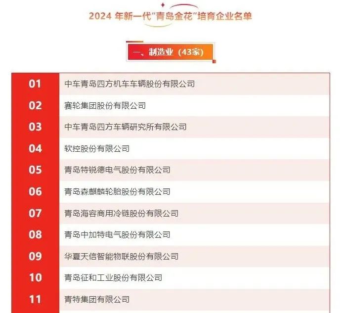 1月2日,青島市工業(yè)和信息化局、青島市發(fā)展和改革委員會、青島市農業(yè)農村局聯(lián)合發(fā)布《2024年新一代“青島金花”培育企業(yè)名單》,共計入選企業(yè)109家。青特集團憑借其在智能制造領域的持續(xù)創(chuàng)新和卓越表現(xiàn),自2020年起連續(xù)5年入選該榜單。