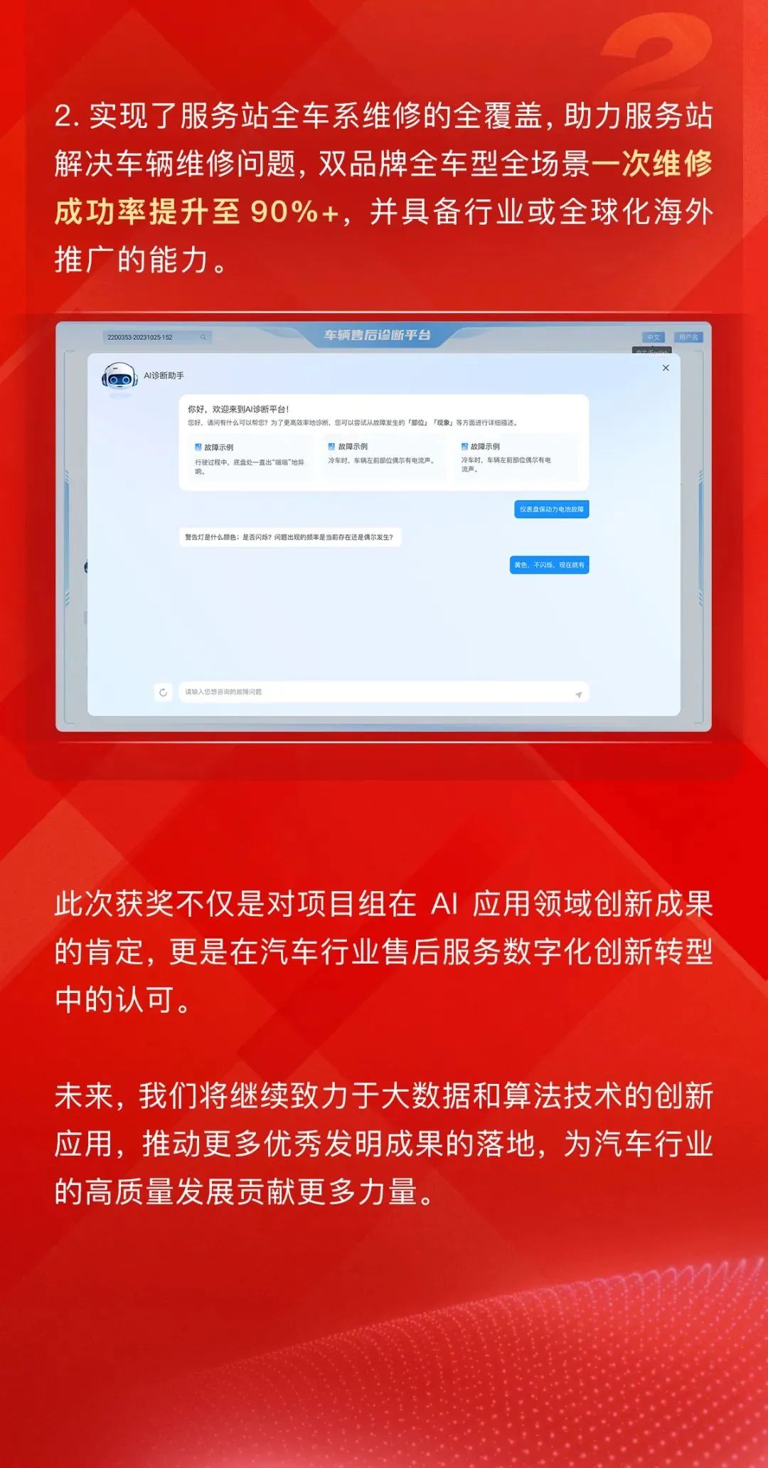 日前,由上海市總工會、上海市知識產權局、共青團上海市委員會、上海市科學技術協會、上海市發明協會等單位聯合舉辦的第 36屆上海市優秀發明選拔賽評獎結果公布,經選拔、評審、答辯等環節,上汽乘用車數據及信息系統部的 AI算法應用產品-車輛維修大模型榮獲發明創新金獎。