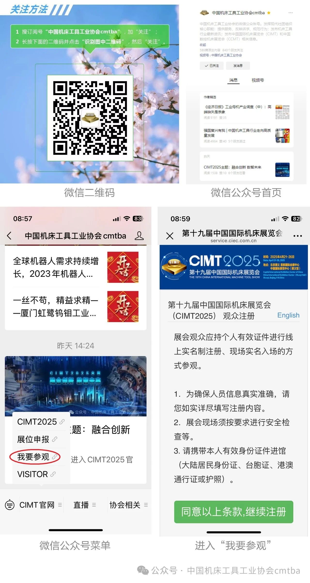 關注“中國機床工具工業協會cmtba”微信訂閱號, 點擊下方菜單“CIMT官網”中“我要參觀”,進入菜單并注冊成功后,可在展會現場自助機打印入場證。