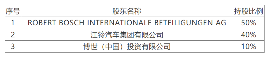 近日,博世電驅動系統(南昌)有限公司成立,經營范圍含汽車零部件及配件制造、電機制造、電機及其控制系統研發、機電耦合系統研發、汽車零配件批發、零售等。股東信息顯示,該公司由ROBERT BOSCH INTERNATIONALE BETEILIGUNGEN AG、江鈴汽車集團有限公司、博世(中國)投資有限公司共同持股。該合資公司的注冊資本為5億元人民幣(約合6300萬歐元),股權結構為博世持股60%,江鈴集團持股40%。