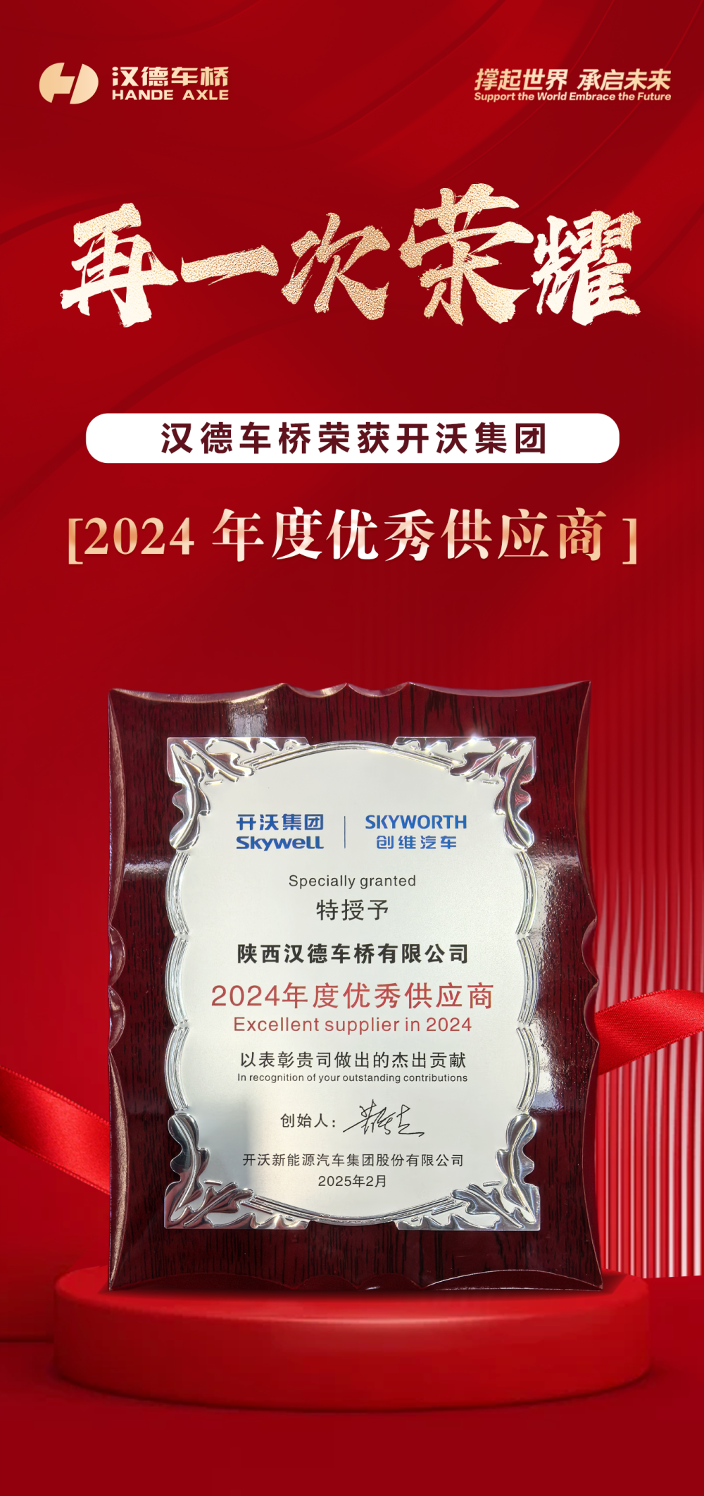 陜西漢德車橋有限公司榮獲開沃集團“2024年度優(yōu)秀供應商”。