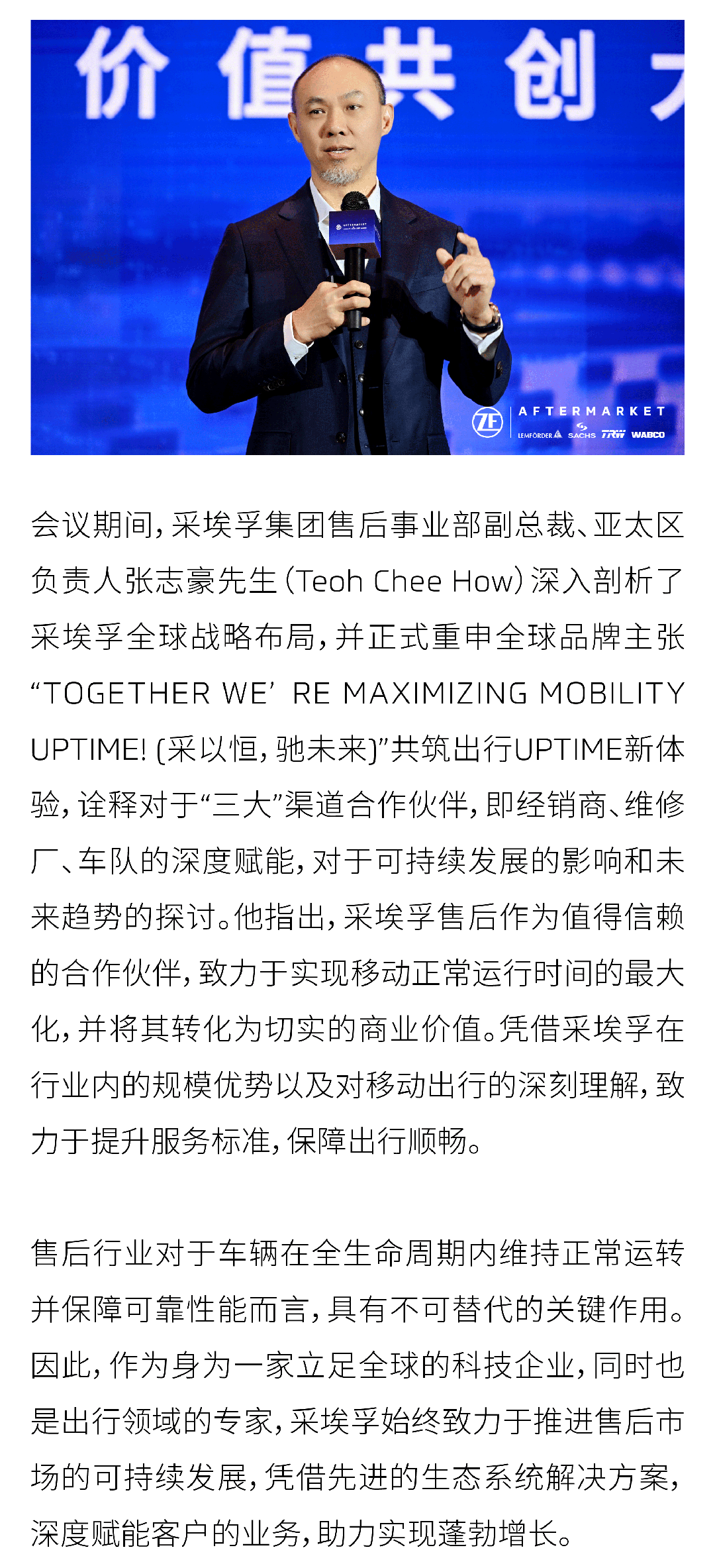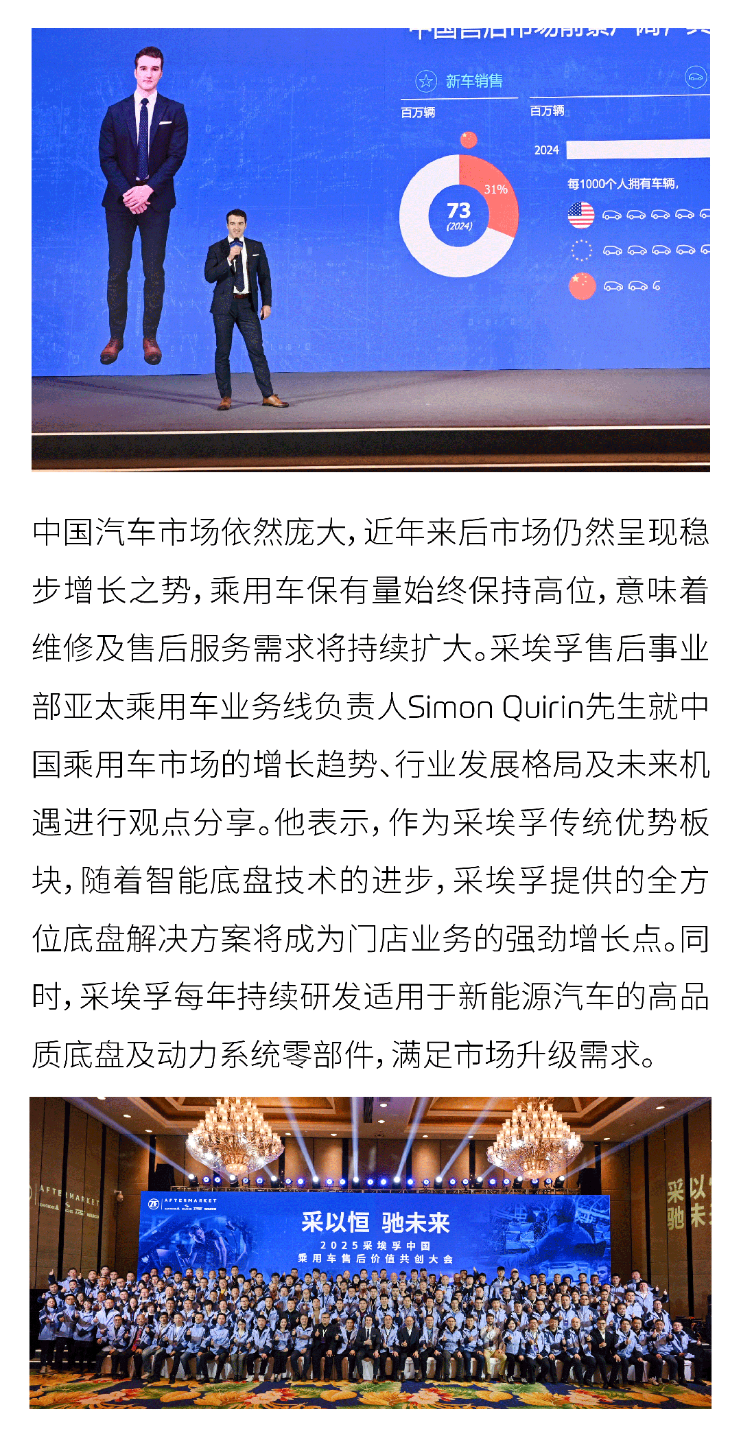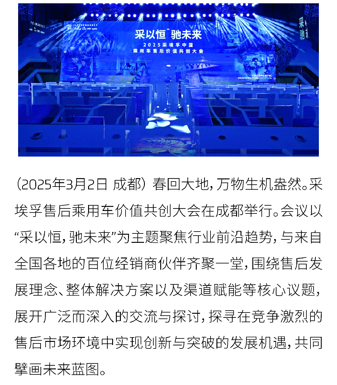 (2025年3月2日成都)春回大地,萬物生機盎然。采埃孚售后乘用車價值共創大會在成都舉行。會議以“采以恒,馳未來”為主題聚焦行業前沿趨勢,與來自全國各地的百位經銷商伙伴齊聚一堂,圍繞售后發展理念、整體解決方案以及渠道賦能等核心議題,展開廣泛而深入的交流與探討,探尋在競爭激烈的售后市場環境中實現創新與突破的發展機遇,共同擘畫未來藍圖。
