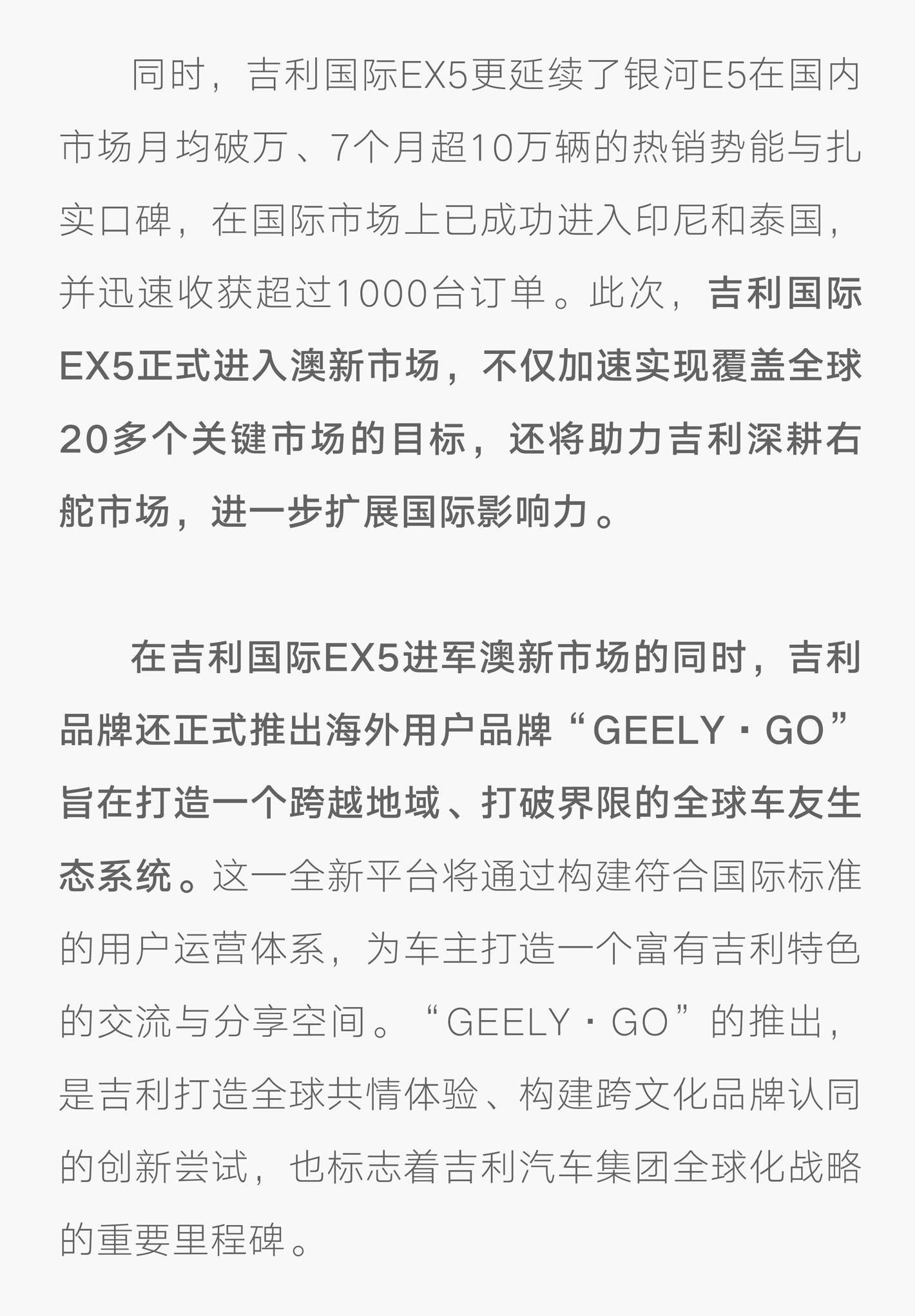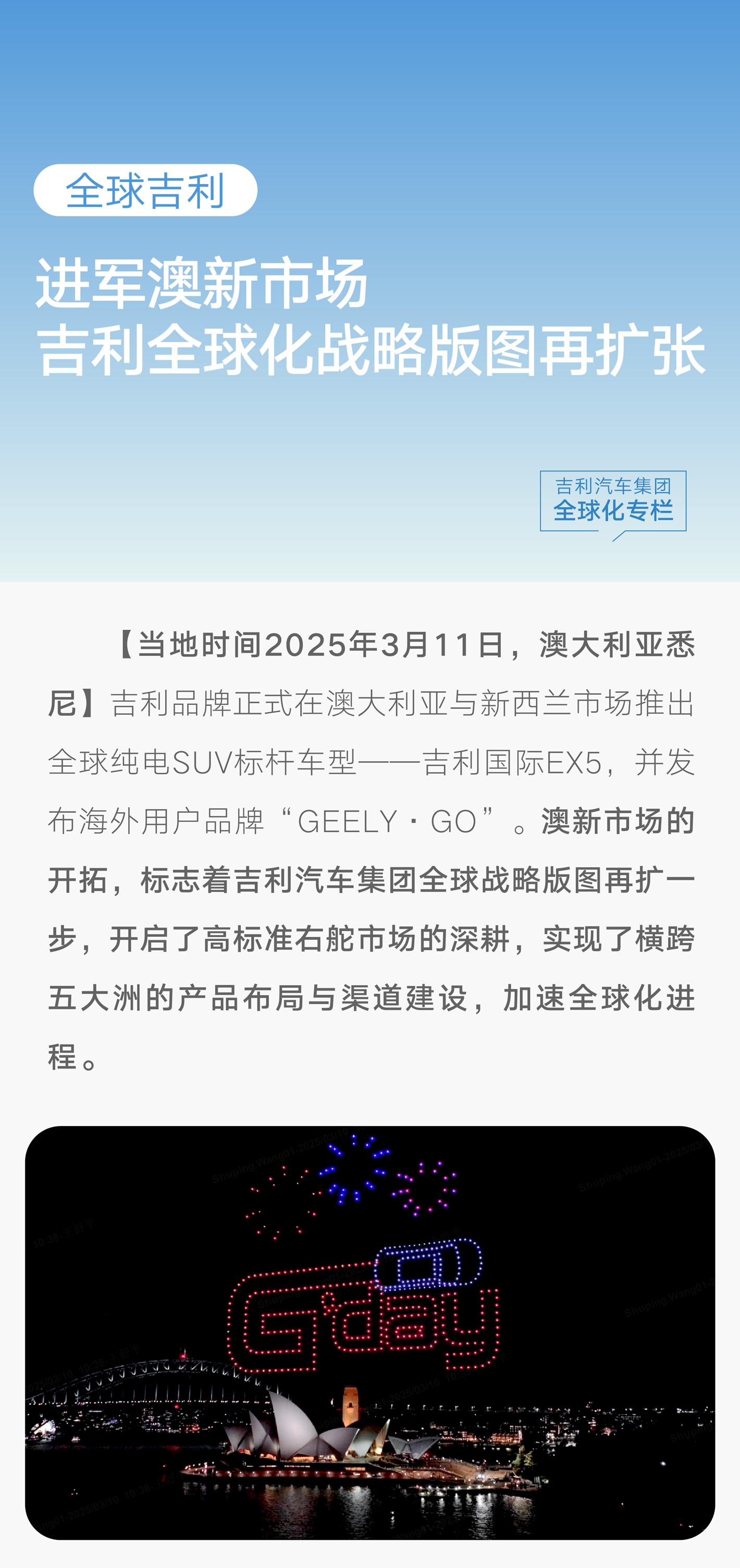 【當(dāng)?shù)貢r間2025年3月11日,澳大利亞悉尼]吉利品牌正式在澳大利亞與新西蘭市場推出全球純電SUV標(biāo)桿車型一一吉利國際EX5,并發(fā)布海外用戶品牌“GEELY·GO”。