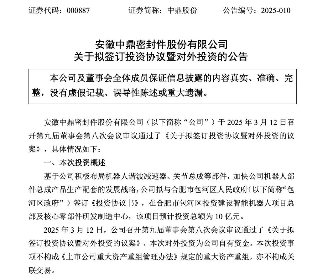中鼎股份表示,本次投資是基于未來整體發(fā)展戰(zhàn)略規(guī)劃,通過有效整合優(yōu)勢資源,積極布局機器人諧波減速器、關節(jié)總成等部件,加快中鼎股份機器人部件總成產品生產配套的發(fā)展戰(zhàn)略,完善公司業(yè)務布局,提升公司綜合競爭力,滿足公司的戰(zhàn)略發(fā)展規(guī)劃以及市場需求。