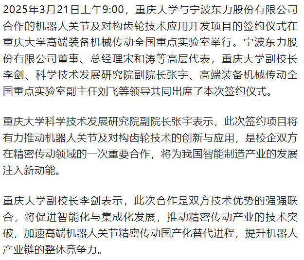 2025年3月21日上午9:00,重慶大學(xué)與寧波東力股份有限公司合作的機器人關(guān)節(jié)及對構(gòu)齒輪技術(shù)應(yīng)用開發(fā)項目的簽約儀式在重慶大學(xué)高端裝備機械傳動全國重點實驗室舉行。