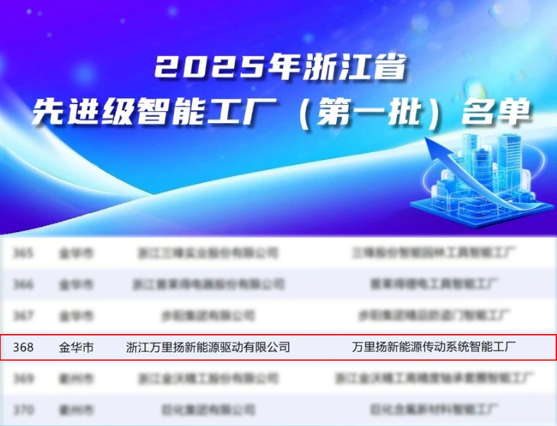近日,浙江省經濟和信息化廳發布了2025年浙江省先進級智能工廠(第一批)名單,萬里揚新能源傳動系統智能工廠成功入選。近日,浙江省經濟和信息化廳發布了2025年浙江省先進級智能工廠(第一批)名單,萬里揚新能源傳動系統智能工廠成功入選。