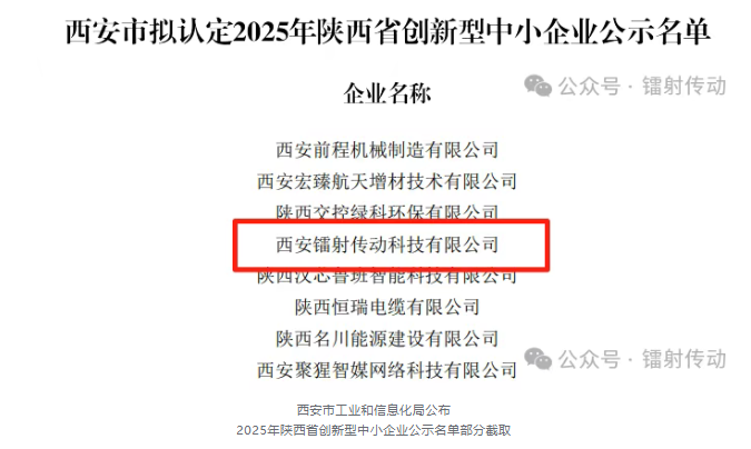 陜西省創(chuàng)新型中小企業(yè)認定聚焦“專業(yè)化、精細化、特色化、新穎化”維度,鐳射傳動的入選凸顯:
