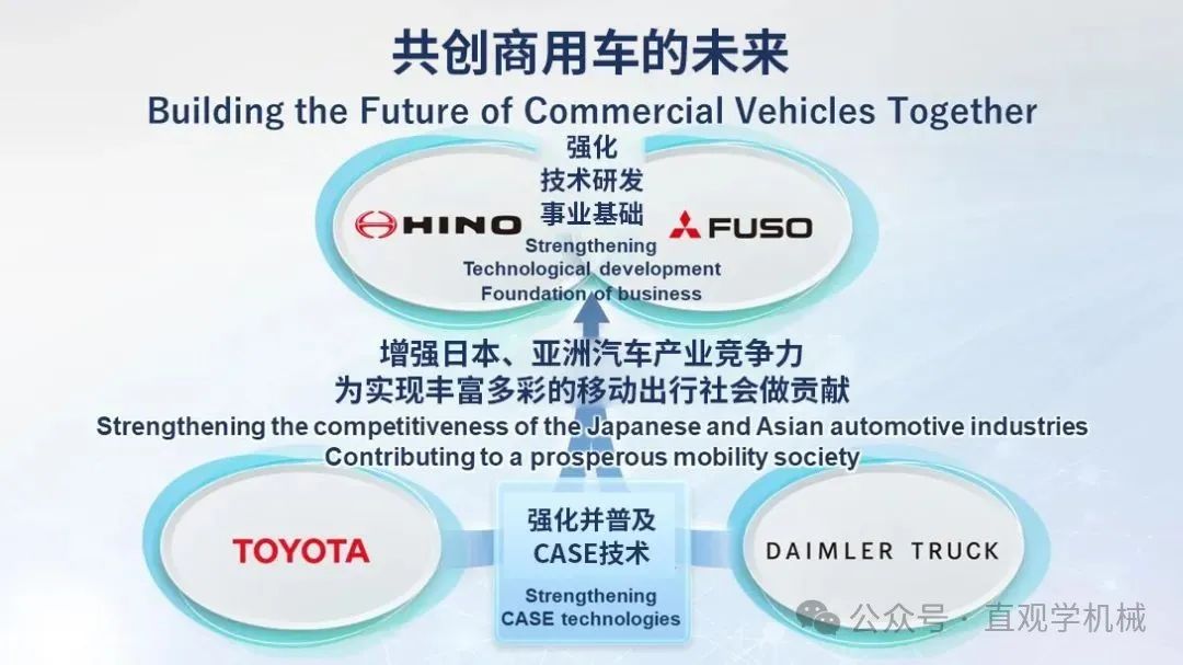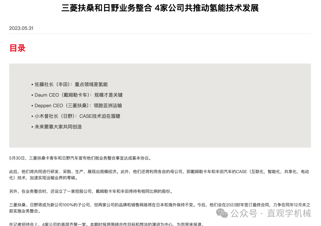 其實,早在2023年5月,豐田、日野汽車、戴姆勒卡車、三菱扶桑4家公司就2024年底之前統合業務達成基本協議。然而,原本計劃在2024年2月簽署最終協議,卻因為日野汽車的發動機認證造假一事不得不被迫無限期推遲,時間來到2025年,事情出現轉機,雙方重啟合并談判,4月份的時候多家日媒就透露豐田、日野汽車、戴姆勒卡車、三菱扶桑就業務整合基本確定,并最早有望在5月簽署最終協議,雖然最終時間遲了一個月,但總算是定了下來。