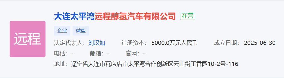 吉利旗下浙江遠(yuǎn)程新能源商用車集團(tuán)有限公司與大連太平灣合作創(chuàng)新區(qū)合創(chuàng)產(chǎn)業(yè)投資有限公司在大連合資成立遠(yuǎn)程醇?xì)淦囉邢薰荆再Y本5000萬元人民幣該公司經(jīng)營范圍涵蓋道路機(jī)動車輛生產(chǎn)等,明顯就是整車廠了。
