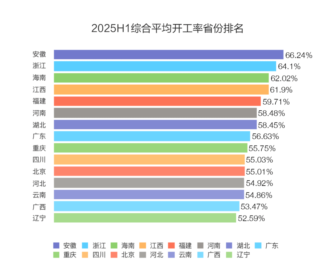 2025年上半年,15個省份平均開工率較去年同期實現增長,分別是:遼寧、河南、安徽、浙江、云南、青海、福建、廣西、新疆、北京、吉林、寧夏、甘肅、江西、海南。