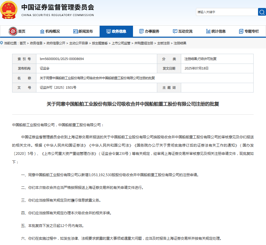 距離上交所審核通過剛過去兩周,“兩船合并”又迎來重要進展:近日,中國證監會發布公告,同意中國船舶換股吸收合并中國重工。