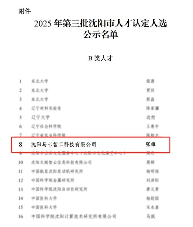 近日,沈陽市人力資源和社會保障局正式公布2025年度高層次人才認定名單,沈陽馬卡智工科技有限公司總工程師張雄憑借在高端數控機床(工業母機)領域的卓越技術創新與產業化貢獻,成功獲評沈陽市B類杰出人才!這一榮譽不僅是對張雄老師個人專業能力的權威認可,更是對MAKA在智能制造領域技術實力的高度肯定。